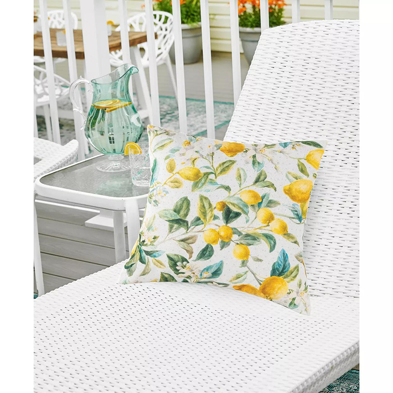 Lemonade anyone? Perfect for your summertime gatherings, this indoor/outdoor pillow is durable enough for outdoor use, and comfortable enough to be used indoors. This pillow is crafted with a soft polyester cover and polyfill for plushness and quick drying. Spot cleaning recommended. Size: 18 x 18 inches