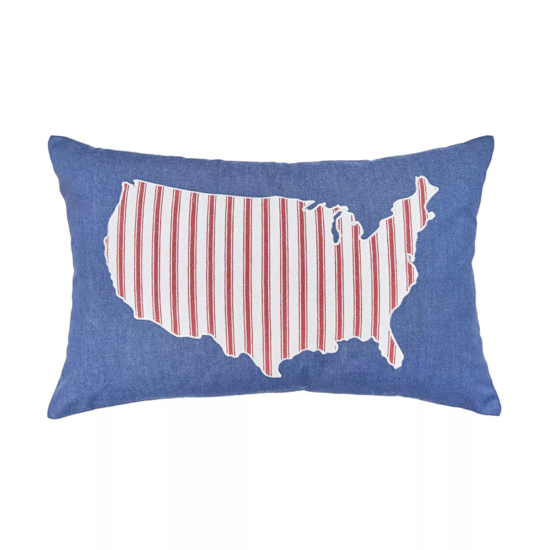 Celebrate the land that you love with the USA Denim accent pillow. A classic red and white stripe applique of the continental United States is layered on a casual denim-inspired ground, making this pillow perfect for your Fourth of July décor or to complete your everyday Americana style. Finished with a clean knife edge and secured with a zipper closure. Crafted with a cotton cover and removable polyester insert for easy care. Spot cleaning recommended. Size: 14-inches x 22-inches