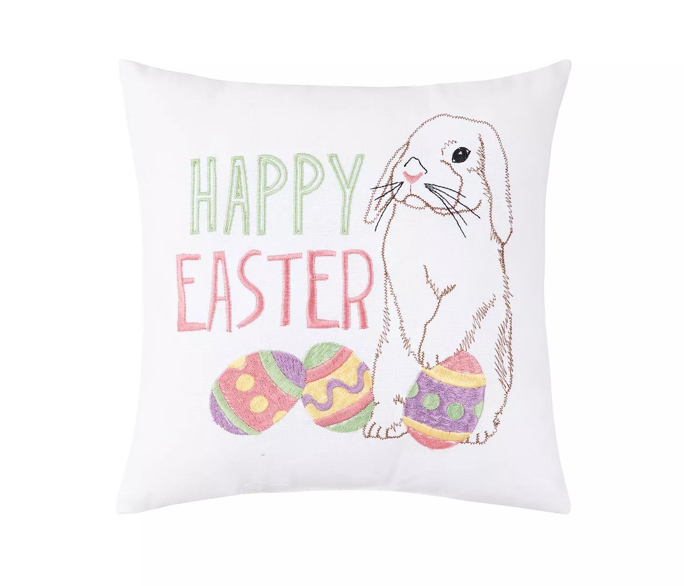 Hop into spring with our Happy Easter Bunny pillow. Embroidered with colorful thread, this bunny holding Easter eggs will add a pop of color to your holiday decoration. The design sits on a bright white ground and is polished off with a clean knife edge. This toss pillow is crafted of cotton with polyester filling.Dimensions (Overall): 10.0 inches (L), 3.0 inches (H) x 10.0 inches (W)Home Bunny Birds Spring Lumber Pillow
