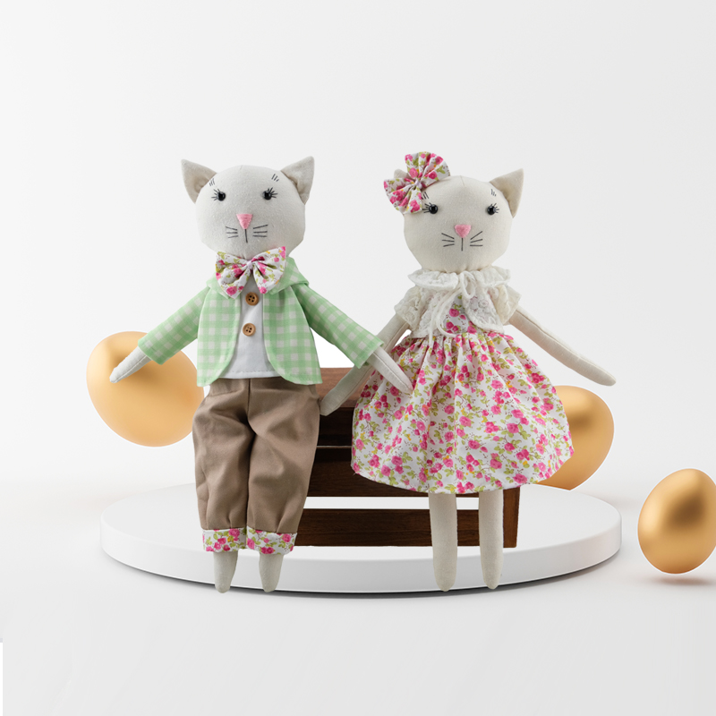 Description:Elegant Polyester Cat Duo with Peach Fabric Detailing for Home Decor